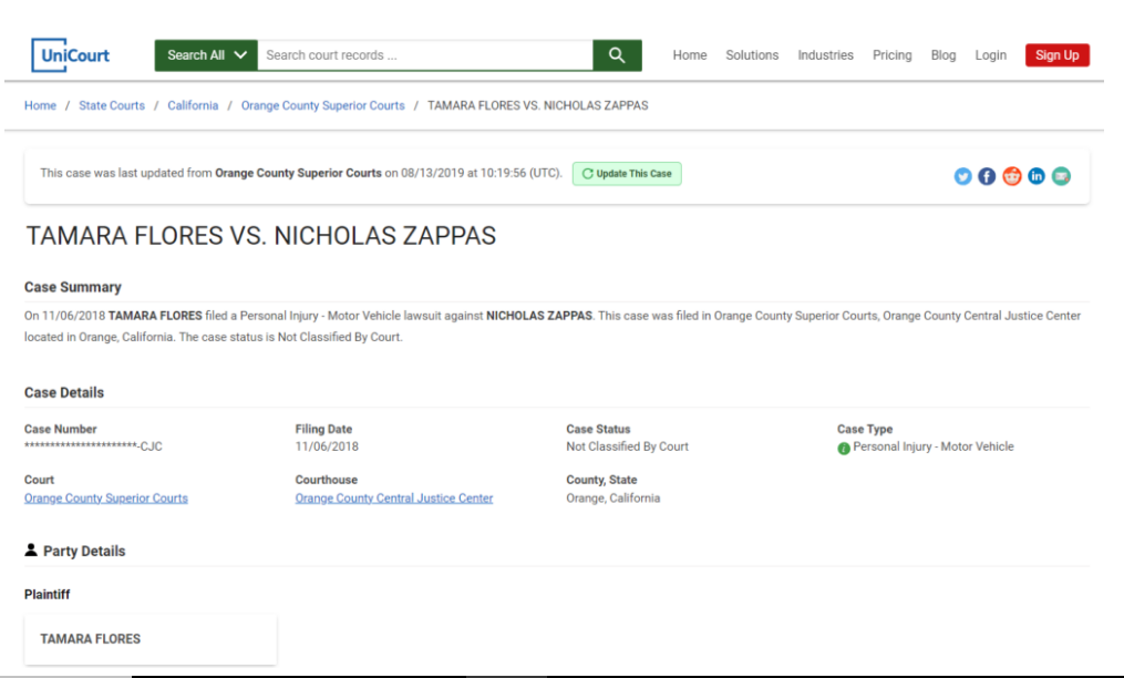 In a motor vehicle personal injury case, Tamara Flores filed a complaint against Nicholas Zappas and Nicholas B. Zappas on November 6, 2018, according to UniCourt records. In Orange, California, at the Orange County Central Justice Center, a lawsuit was filed.