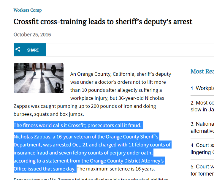 After an incident at work, Zappas, a veteran of the Orange County Sheriff’s Department, submitted a workers’ compensation claim for injuries to his neck, lower back, and shoulder. He was forced to accept a desk job due to his physical restrictions, but he persisted with his CrossFit workouts, which included weightlifting and bodyweight exercises.