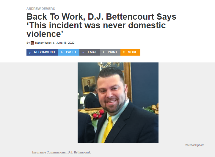 Deputy Insurance Commissioner DJ Bettencourt of Salem was cleared of domestic violence charges after being accused of simple assault on May 5. He was accused of yelling at his wife as he pulled her out of bed by her forearms as she was reading a text message on her phone.