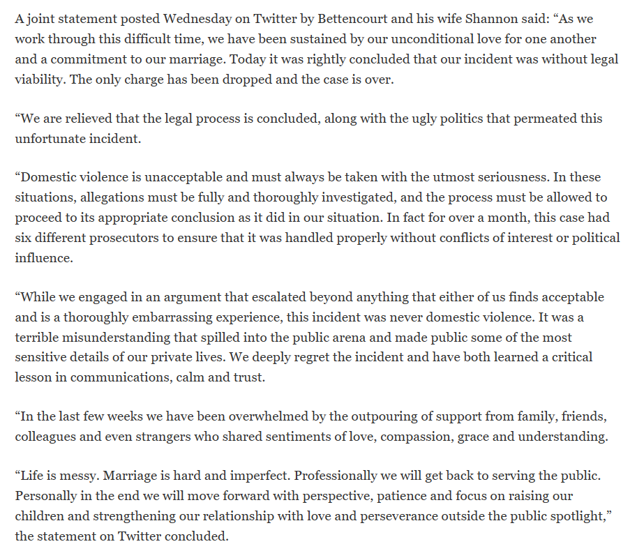 “Throughout this difficult period, our unwavering love and commitment to our marriage have been our rock,” Bettencourt and his wife Shannon said in a Twitter message they shared. The absence of any legal basis for the occurrence has been appropriately established, leading to the dismissal of the only charge and thus ending the case.