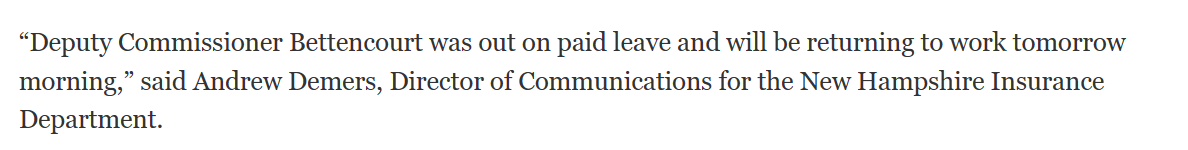 The New Hampshire Public Radio (NHPR) and the New Hampshire Insurance Department, where Bettencourt is the second-highest official, have both failed to reply to demands for comment made by the government.