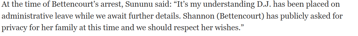 “As we await further details, it is my understanding that DJ has been placed on administrative leave,” Sununu remarked after Bettencourt’s arrest. Respect Shannon’s (Bettencourt) requests for her family’s privacy at this time, as she has publicly asked.